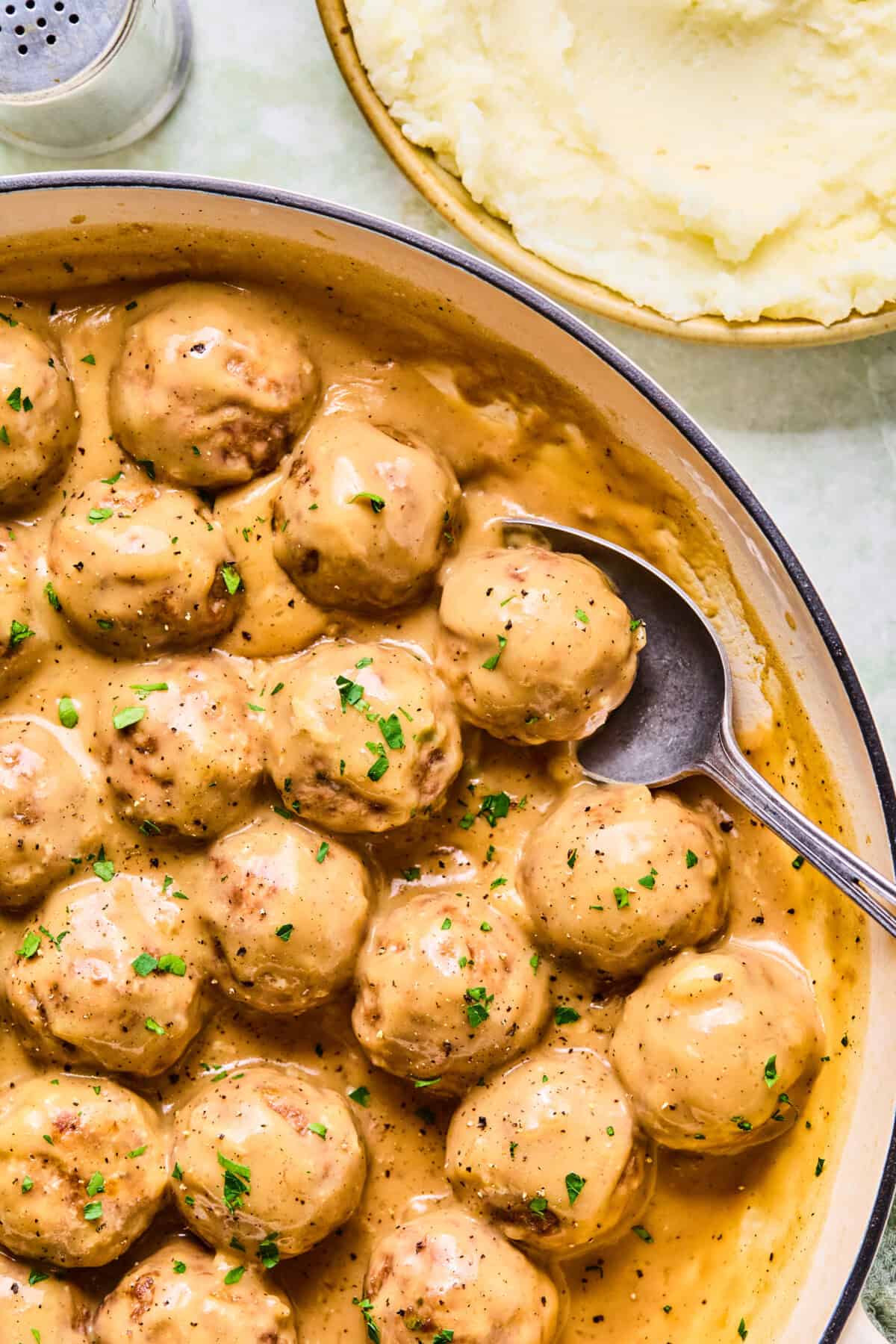 Meatballs and gravy is the definition of comfort food. The combo of beef and pork makes these meatballs tender, juicy and full of savory flavor.
