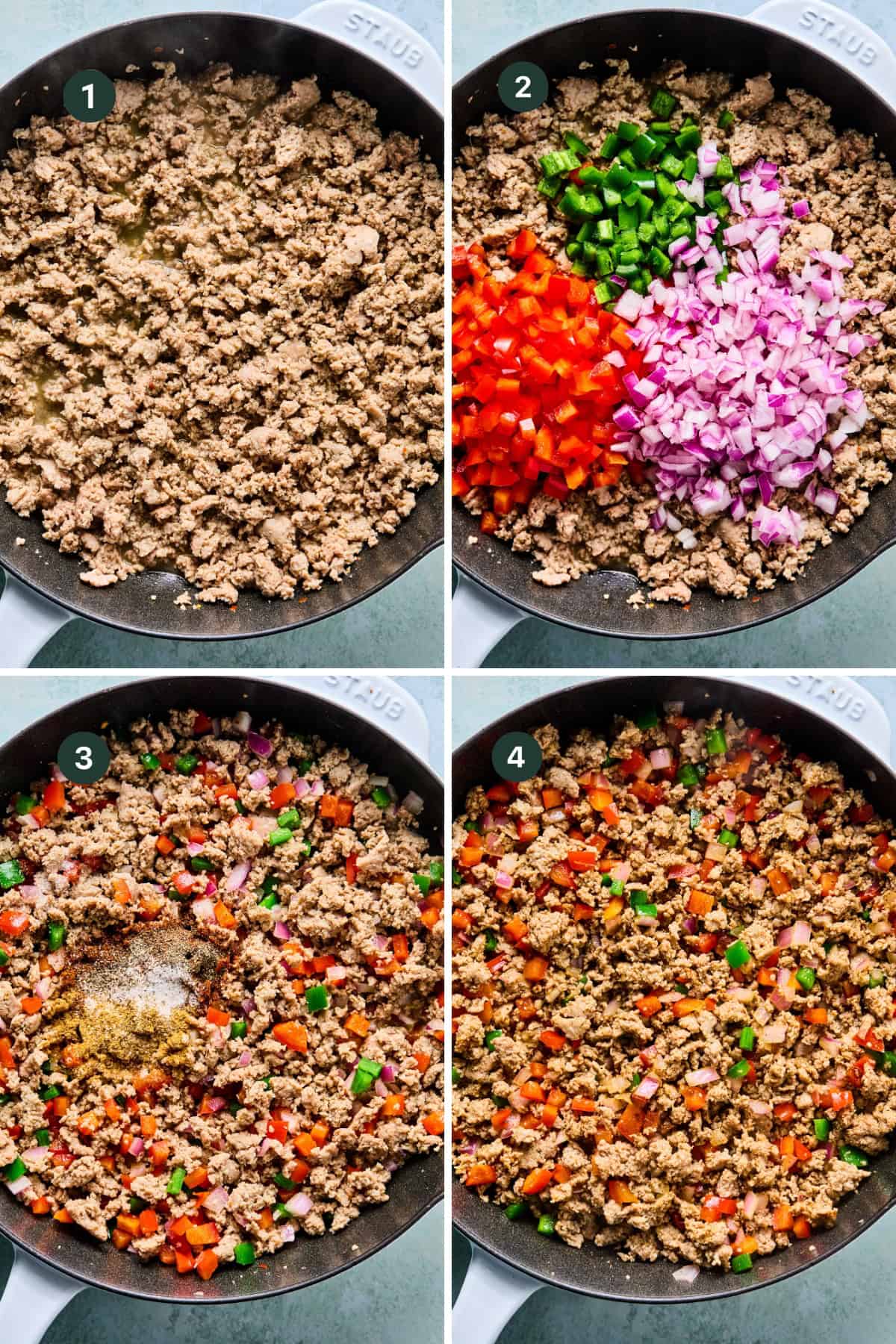 - Once the meat is cooked, add the bell pepper, onion and jalapeño to the pan with the turkey. Cook, stirring occasionally, until the vegetables are tender, about 5 minutes. Add the chili powder, cumin, salt and pepper and stir to combine. Remove from heat.